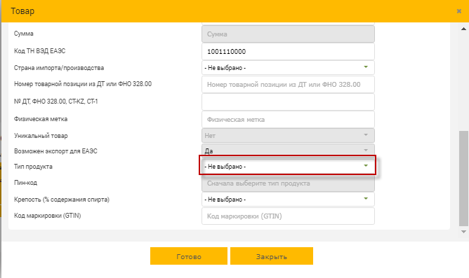 8. Заполните остальные поля при вводе остатков по алкогольной, табачной или по нефтепродуктам укажите Тип продукта.
