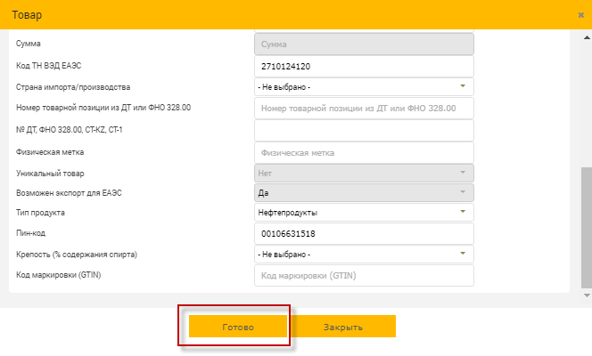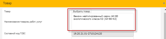 11. После выбора ПИН-кода заполнится поле «Наименование товаров, услуг» согласно ПИН-кода.