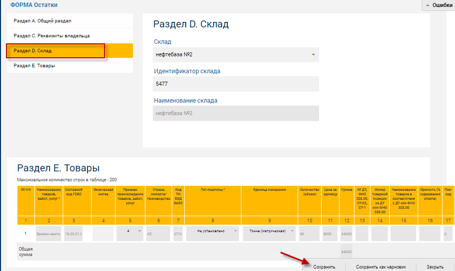 13. Заполните остальные поля Формы, в том числе укажите склад, на котором будет размещен . При вводе подакцизных товаров склад должен быть ОВД или лицензия.