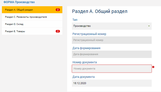 1. Для создания Формы «Производство» нажмите кнопку2. После выбора типа Формы отображается набор полей, соответствующий выбранному типу.