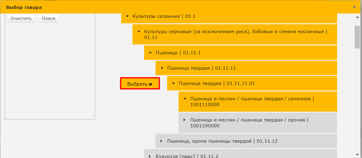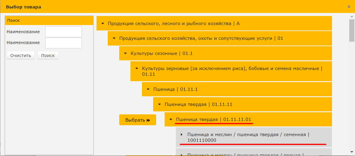 7. Выберите нужный товар из справочника 1 уровня или из справочника 2 уровня ТН ВЭД.