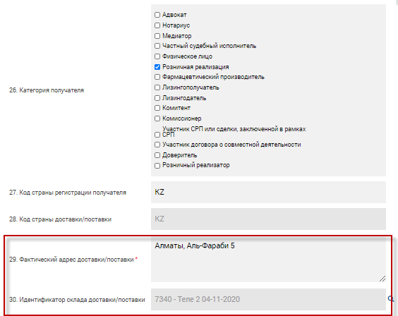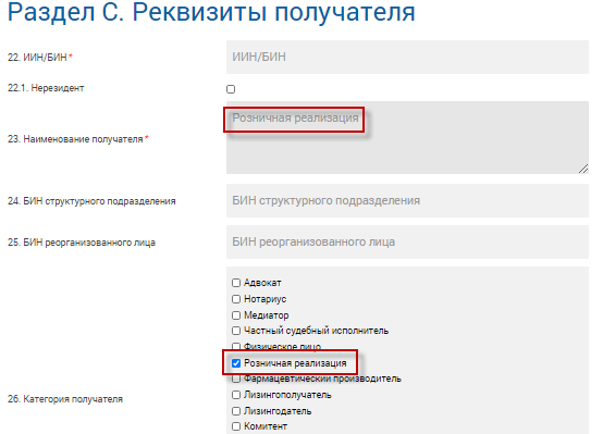 2. При указании категории «Розничная реализация» автоматически заполняется поля 23. «Наименование получателя» значением «Розничная реализация».