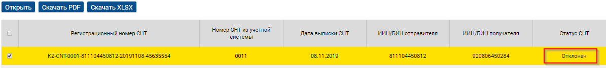 1. Для отклонения доступны СНТ в статусе «Доставлен». Для отклонения СНТ в журнале СНТ выберете СНТ и нажмите кнопку «Отклонение»